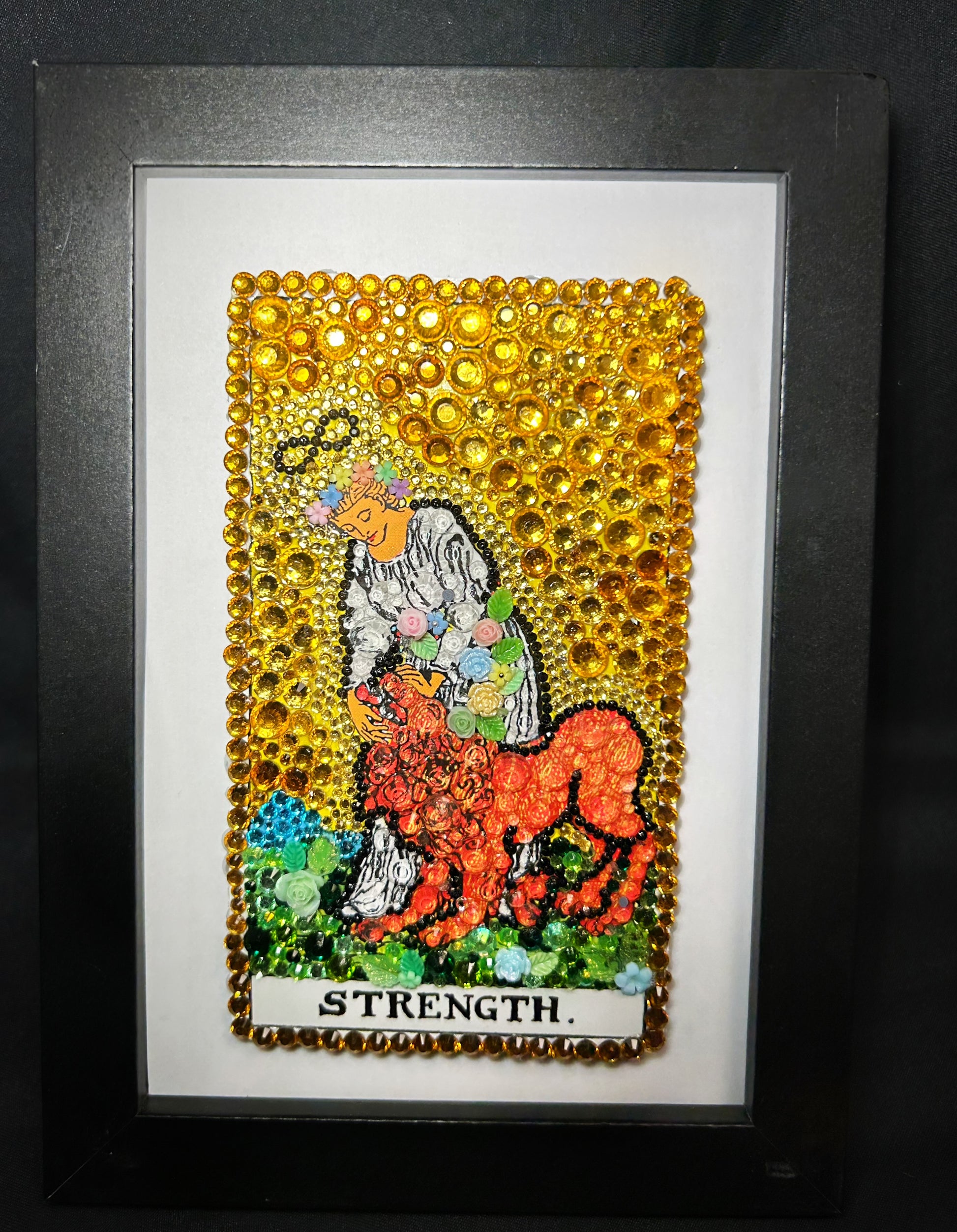 I create unique, custom-made tarot cards adorned with a variety of gems in different shapes, sizes, and colors. Each card is crafted to order and no two cards will be alike. These cards are distinct and one-of-a-kind, radiating the spiritual energy represented by the card itself. Each tarot card includes a Rider-Waite tarot card with hand-placed gems and comes beautifully framed.